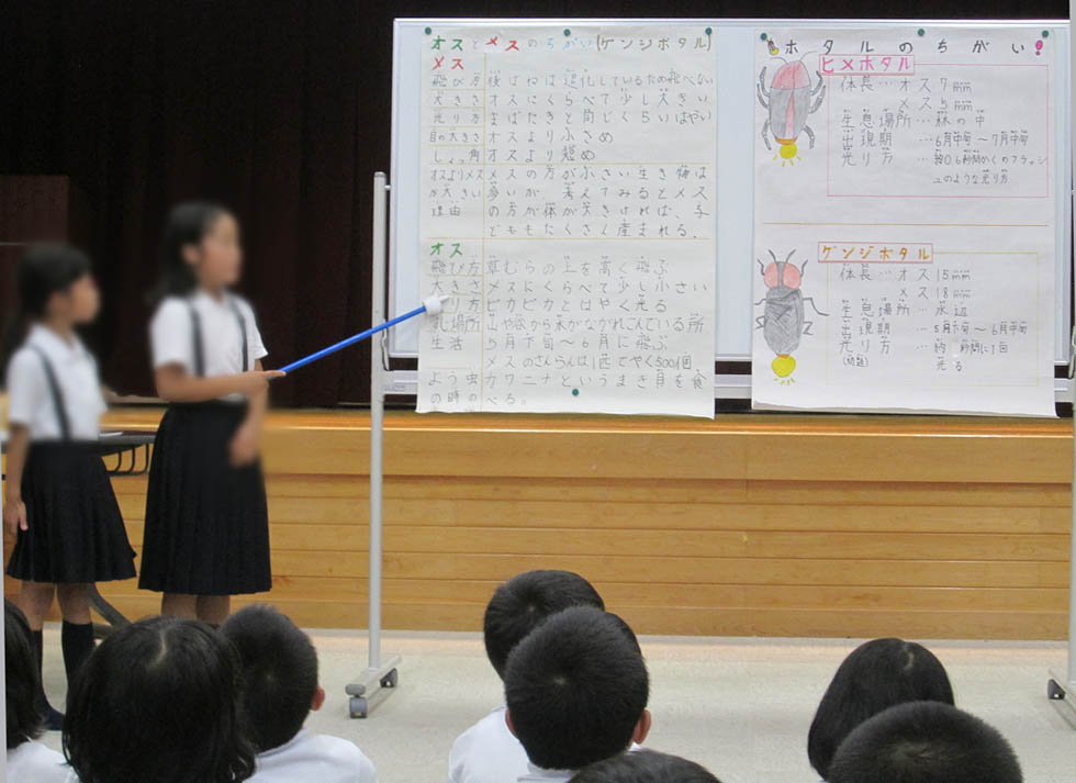 ホタルのことを調べて発表会を行い、全校児童で勉強しました。